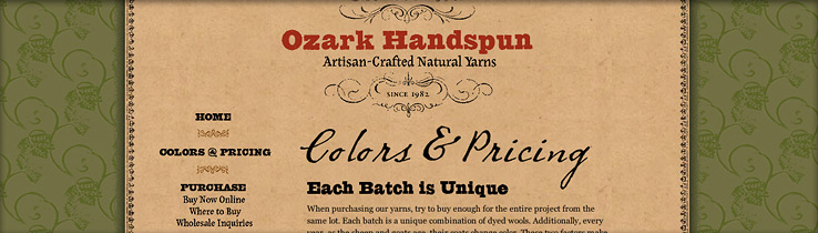 The handmade nature of the yarns sold by this small business in rural Missouri called for old style wood type, an earthy color pallette, and a hand-rendered look and feel for the website.